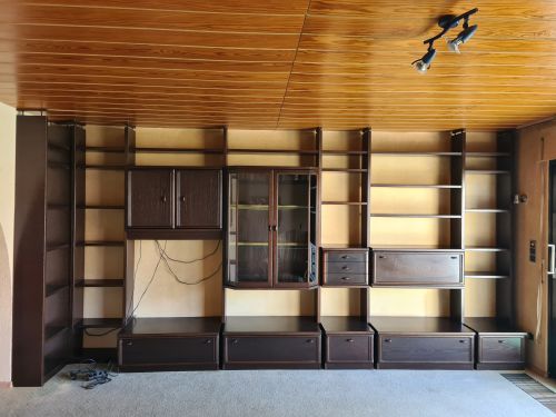 Verschenke eine Schrankwand in der Farbe Dunkelbraun in sehr gutem Zustand. Barfach und Fernsehstellfläche ist beleuchtet. Länge mit Ecke (wie aufgebaut) 488cm, gesamt ohne Ecke bis 524,5cm möglich. Durch die modulare Bauform können die Fächer beliebig kombiniert werden und in 3,2cm Schritten in der Höhe verstellt werden, auch teilen an verschiedene Wände ist möglich. Breite vom Großen Fach 97,0cm , kleines Fach 48,5cm, ohne Seitenwand. Seitenwände 242,0cm hoch (dazu kommt evtl. noch die Verstellung), 3,5cm breit und 26,0cm tief.